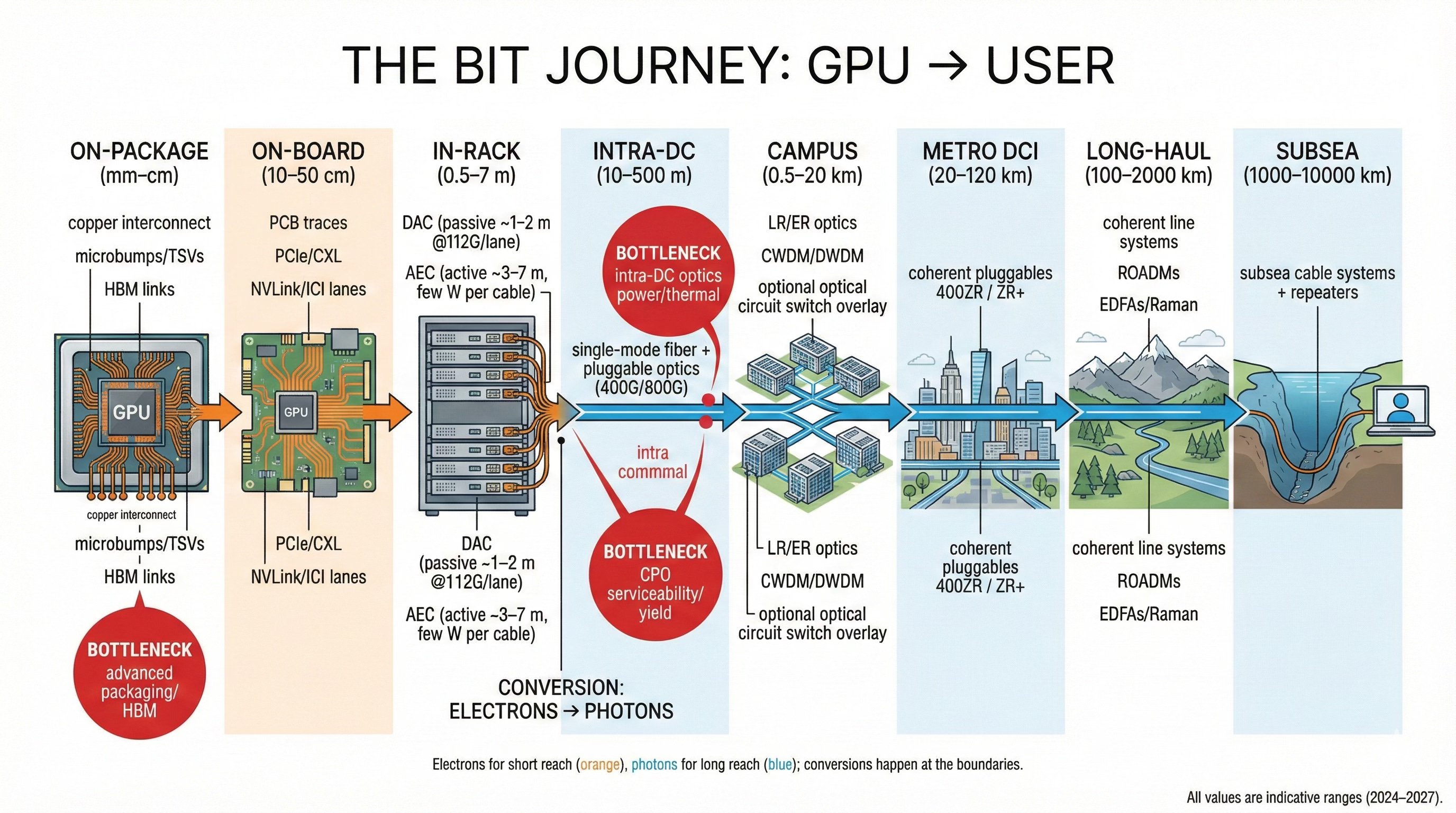 You now understand how a bit moves inside an AI system — from copper traces in a GPU package all the way out to subsea cables.