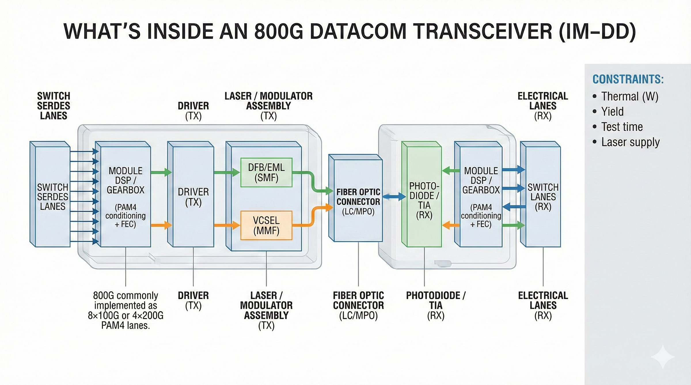 A 400G or 800G IM‑DD module for a datacenter port is a tiny system: