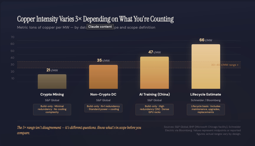 Look at the actual deployments. A standard Microsoft facility in Chicago maps out to roughly 27 tons of copper per megawatt. High-redundancy AI training clusters in Asia push closer to 47 tons per megawatt. Meanwhile, stripped-down crypto mining sites drop down to 21 tons. If you start factoring in lifecycle refits and upgrades over time, those estimates can easily shoot past 60 tons.
