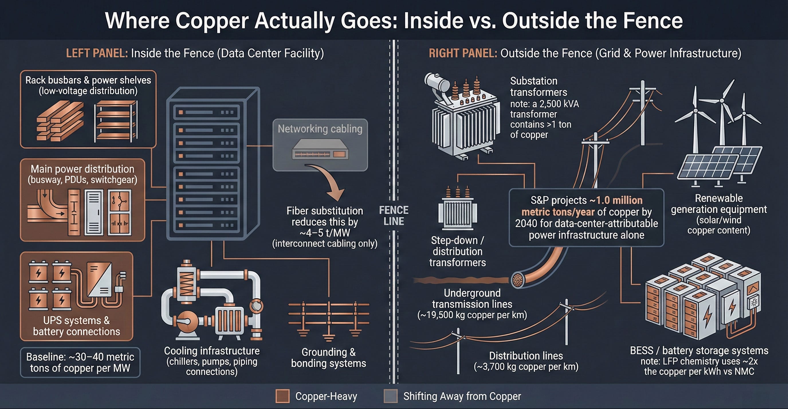 Delete the "200 tons per gigawatt" facility assumption from your spreadsheet immediately. It is a fundamental misread of a busbar subsystem. Your baseline must start at 30 to 40 tons of copper per megawatt of IT capacity for the inside-the-fence build. If you assume aggressive fiber substitution, shave four to five tons off that number. Then, aggressively model the outside-the-fence allocation. The grid and power generation infrastructure required to support these sites acts as a massive, parallel copper multiplier.