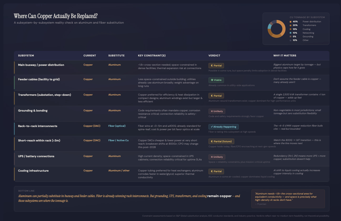 consult a licensed professional before acting.And for skeptics: the real bear case for copper isn’t fiber. It’s aluminum substitution in busway / conductors. But that threat is capped by physics: aluminum needs more cross‑section (space) for the same conductivity, and space is precisely what high‑density racks don’t have.