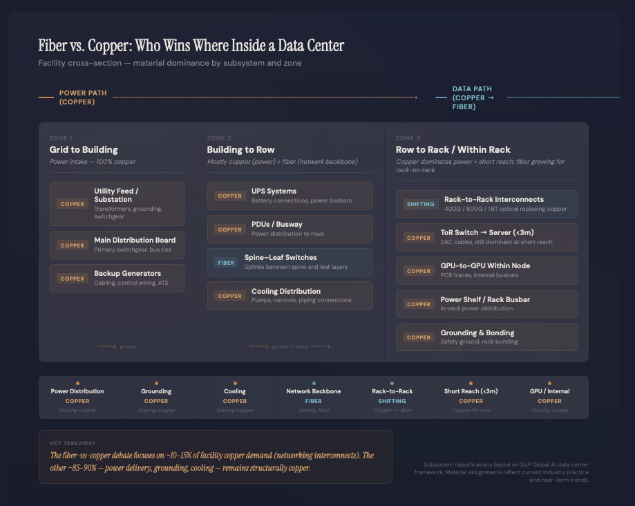 The one place copper actually loses inside the data hall is the interconnect cabling between racks. The industry is undeniably shifting toward fiber here. But you have to look at the actual magnitude. Going all-in on fiber reduces total copper intensity by roughly four to five tons per megawatt. Against a baseline of 30 to 40 tons, you are looking at a ten to fifteen percent haircut. That is a minor efficiency gain, not an extinction event.
