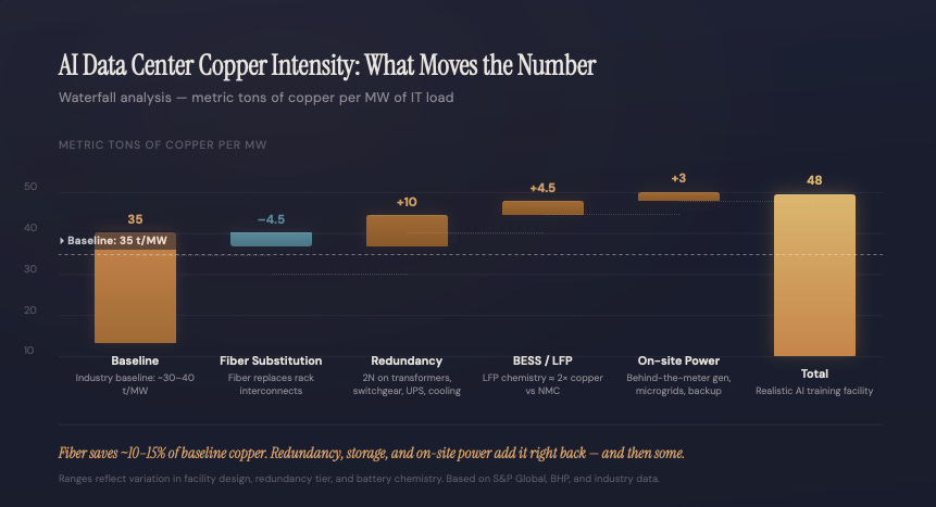 This is exactly why theoretical models fail. They calculate the bare minimum copper needed to run a facility and stop there. Real-world copper intensity is always drastically higher because redundancy forces you to buy the most copper-dense equipment on the campus twice.