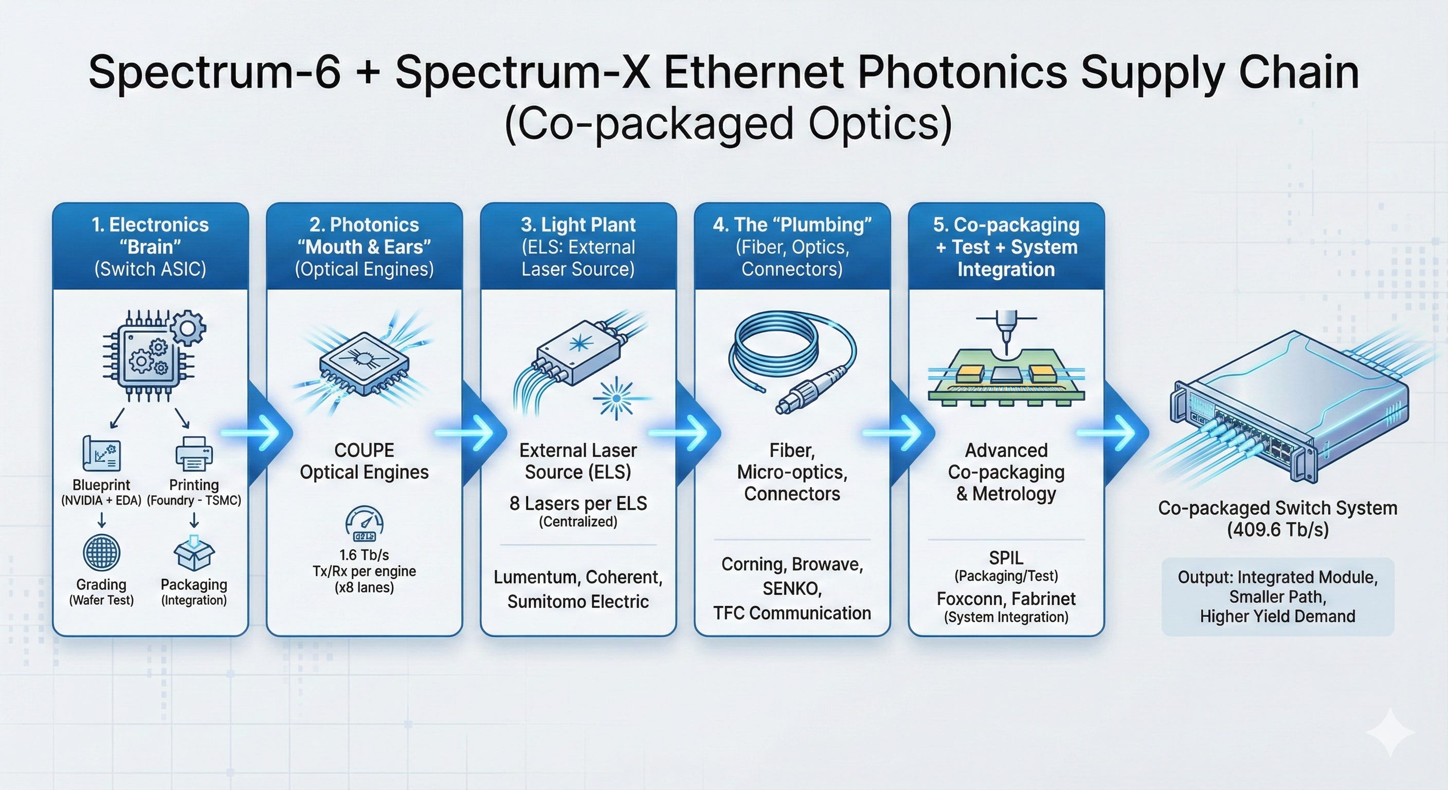 6) Spectrum‑6 + Spectrum‑X Ethernet Photonics (co‑packaged optics): the “future scale‑out” story